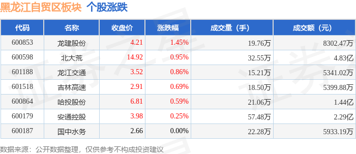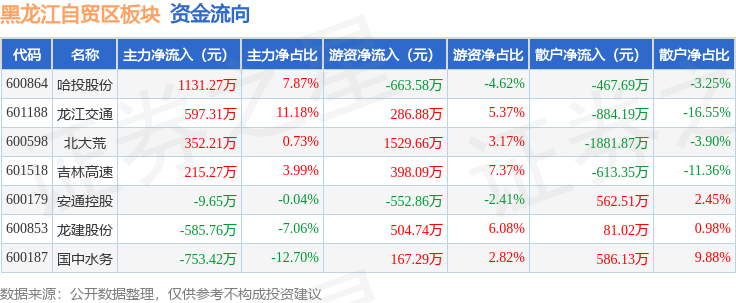 从资金流向上来看,当日黑龙江自贸区板块主力资金净流入947.24万元,游资资金净流入1670.2万元,散户资金净流出2617.44万元。黑龙江自贸区板块个股资金流向见下表: