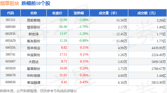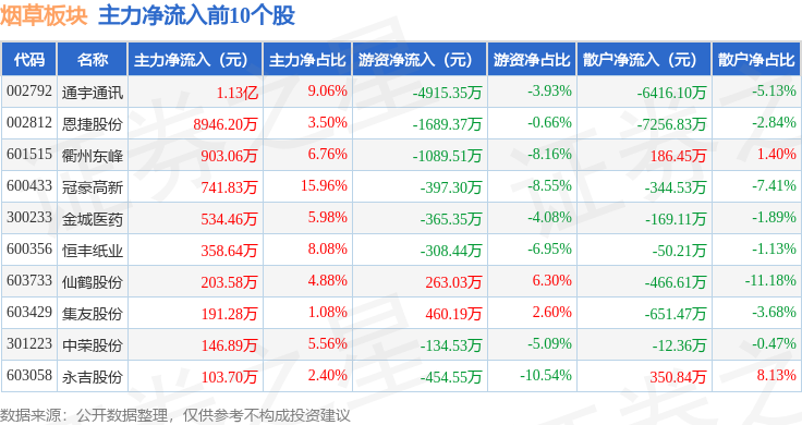 从资金流向上来看,当日烟草板块主力资金净流入1.17亿元,游资资金净流出1.03亿元,散户资金净流出1387.09万元。烟草板块个股资金流向见下表: