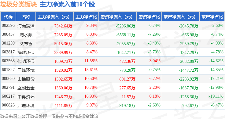 从资金流向上来看,当日垃圾分类板块主力资金净流入2763.62万元,游资资金净流出1271.96万元,散户资金净流出1491.66万元。垃圾分类板块个股资金流向见下表:
