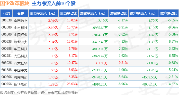 从资金流向上来看,当日国企改革板块主力资金净流出25.01亿元,游资资金净流入20.05亿元,散户资金净流入4.96亿元。国企改革板块个股资金流向见下表: