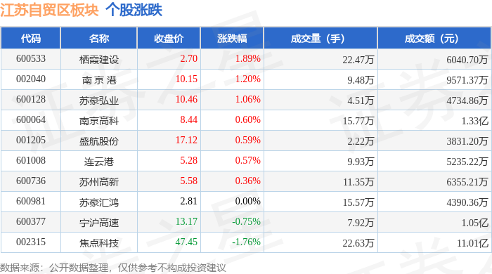 证券之星消息,11月25日江苏自贸区板块较上一交易日下跌0.24%,焦点科技领跌。当日上证指数报收于3870.02,上涨0.87%。深证成指报收于12777.31,上涨1.53%。江苏自贸区板块个股涨跌见下表: