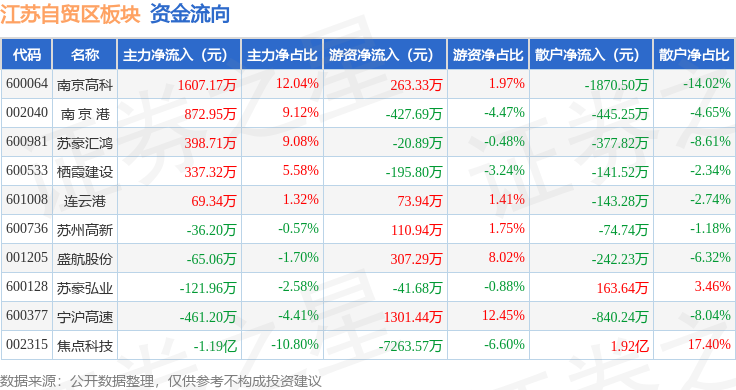 从资金流向上来看,当日江苏自贸区板块主力资金净流出9289.85万元,游资资金净流出5892.69万元,散户资金净流入1.52亿元。江苏自贸区板块个股资金流向见下表: