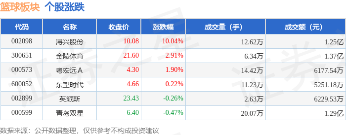 证券之星消息,11月25日篮球板块较上一交易日上涨2.0%,浔兴股份领涨。当日上证指数报收于3870.02,上涨0.87%。深证成指报收于12777.31,上涨1.53%。篮球板块个股涨跌见下表: