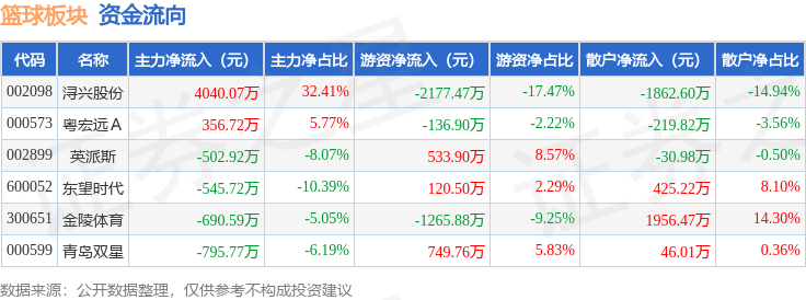 从资金流向上来看,当日篮球板块主力资金净流入1861.78万元,游资资金净流出2176.09万元,散户资金净流入314.31万元。篮球板块个股资金流向见下表: