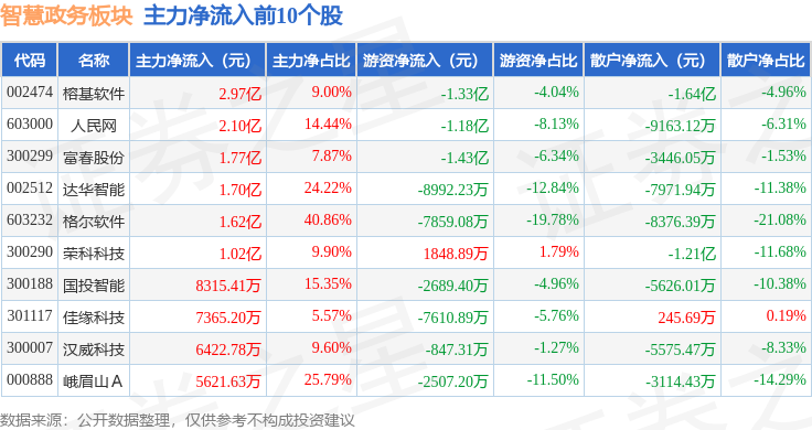 从资金流向上来看,当日智慧政务板块主力资金净流出11.99亿元,游资资金净流出4.96亿元,散户资金净流入16.95亿元。智慧政务板块个股资金流向见下表: