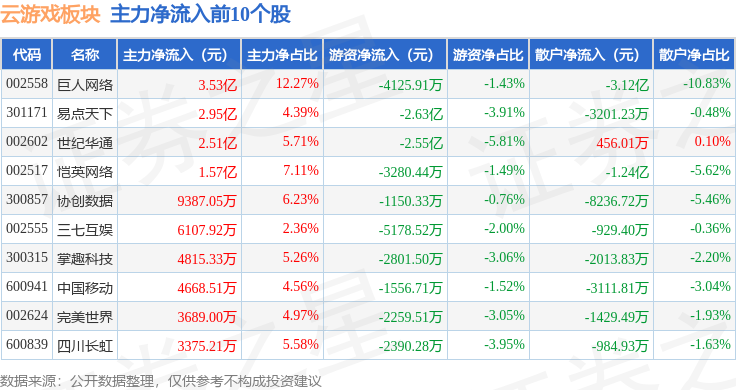 从资金流向上来看,当日云游戏板块主力资金净流出7727.46万元,游资资金净流出1.76亿元,散户资金净流入2.53亿元。云游戏板块个股资金流向见下表: