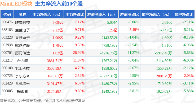 从资金流向上来看,当日MiniLED板块主力资金净流入12.92亿元,游资资金净流出6.71亿元,散户资金净流出6.21亿元。MiniLED板块个股资金流向见下表: