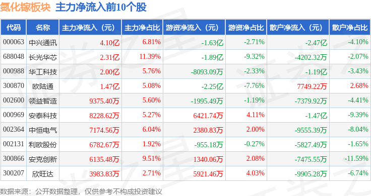 从资金流向上来看,当日氮化镓板块主力资金净流入8161.96万元,游资资金净流出1.74亿元,散户资金净流入9264.67万元。氮化镓板块个股资金流向见下表: