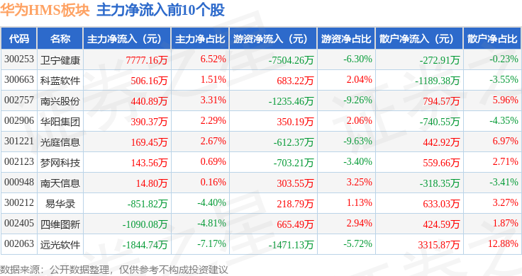 从资金流向上来看,当日华为HMS板块主力资金净流出7.03亿元,游资资金净流入1.34亿元,散户资金净流入5.7亿元。华为HMS板块个股资金流向见下表: