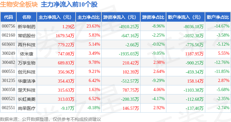 从资金流向上来看,当日生物安全板块主力资金净流入1.43亿元,游资资金净流出3677.37万元,散户资金净流出1.07亿元。生物安全板块个股资金流向见下表: