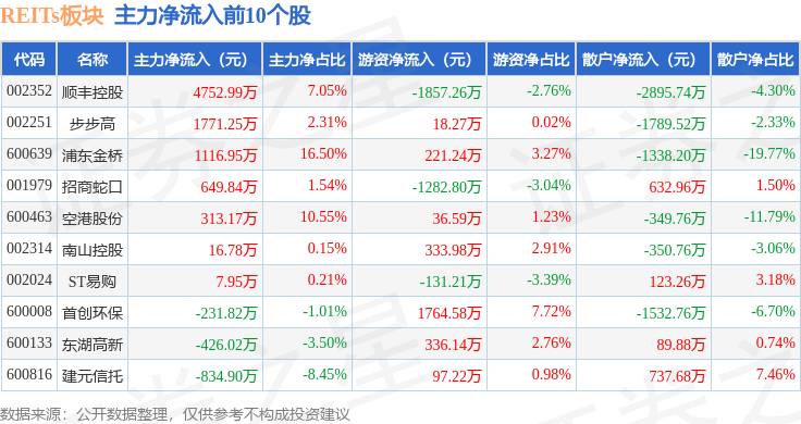 从资金流向上来看,当日REITs板块主力资金净流出2.43亿元,游资资金净流入2.14亿元,散户资金净流入2905.6万元。REITs板块个股资金流向见下表: