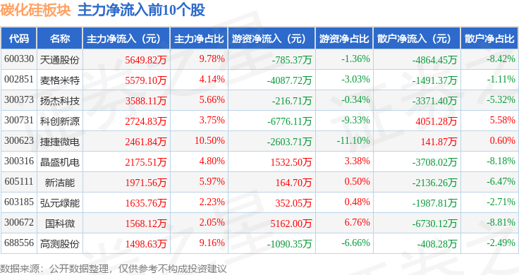从资金流向上来看,当日碳化硅板块主力资金净流出1.85亿元,游资资金净流入7118.7万元,散户资金净流入1.14亿元。碳化硅板块个股资金流向见下表:
