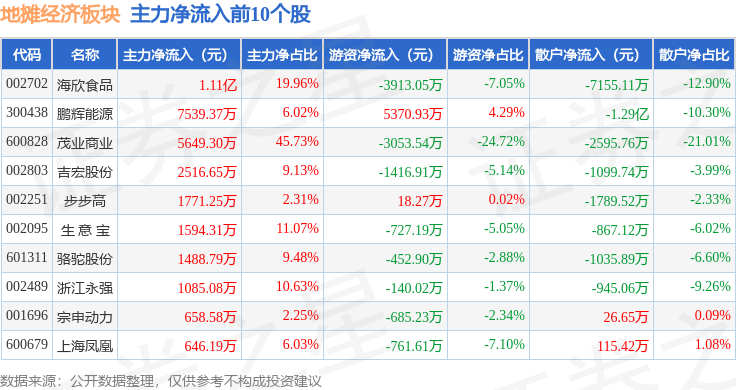从资金流向上来看,当日地摊经济板块主力资金净流出1.5亿元,游资资金净流入9860.68万元,散户资金净流入5143.42万元。地摊经济板块个股资金流向见下表: