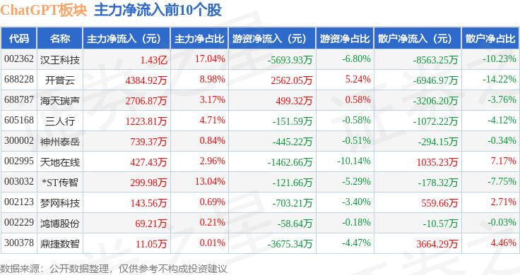 从资金流向上来看,当日ChatGPT板块主力资金净流出26.74亿元,游资资金净流入4.94亿元,散户资金净流入21.8亿元。ChatGPT板块个股资金流向见下表: