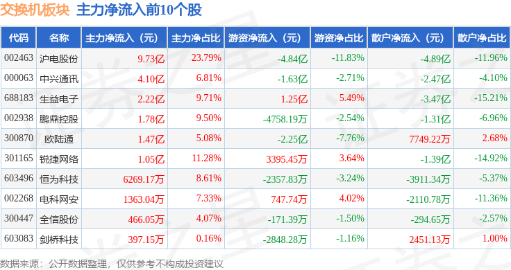 从资金流向上来看,当日交换机板块主力资金净流入16.66亿元,游资资金净流出6.43亿元,散户资金净流出10.24亿元。交换机板块个股资金流向见下表: