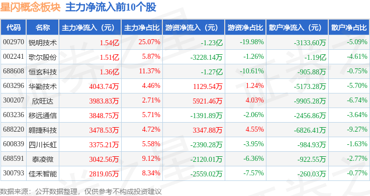 从资金流向上来看,当日星闪概念板块主力资金净流入3.59亿元,游资资金净流出2.27亿元,散户资金净流出1.31亿元。星闪概念板块个股资金流向见下表: