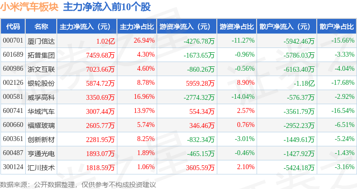 从资金流向上来看,当日小米汽车板块主力资金净流入1423.18万元,游资资金净流入2.46亿元,散户资金净流出2.6亿元。小米汽车板块个股资金流向见下表: