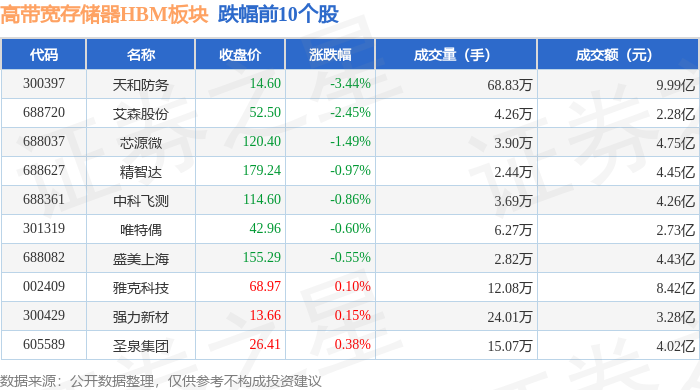 从资金流向上来看,当日高带宽存储器HBM板块主力资金净流出1070.97万元,游资资金净流入125.04万元,散户资金净流入945.93万元。高带宽存储器HBM板块个股资金流向见下表: