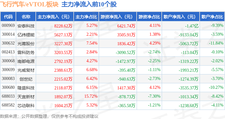 从资金流向上来看,当日飞行汽车/eVTOL板块主力资金净流出8.74亿元,游资资金净流入5.79亿元,散户资金净流入2.94亿元。飞行汽车/eVTOL板块个股资金流向见下表: