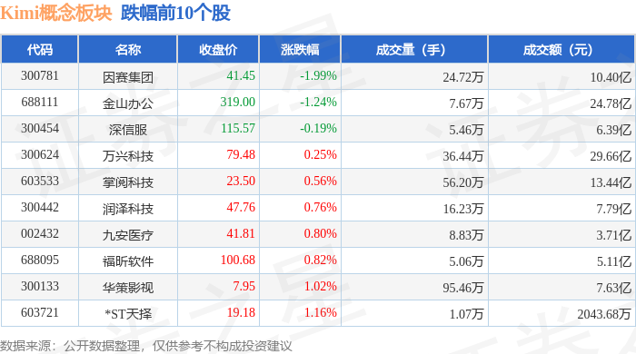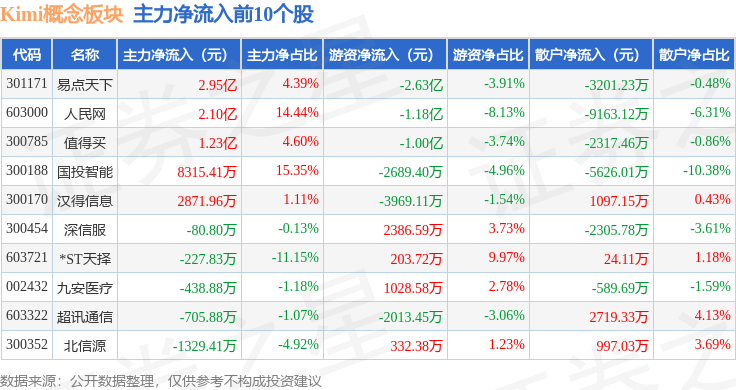 从资金流向上来看,当日Kimi概念板块主力资金净流入1.33亿元,游资资金净流出3.71亿元,散户资金净流入2.38亿元。Kimi概念板块个股资金流向见下表: