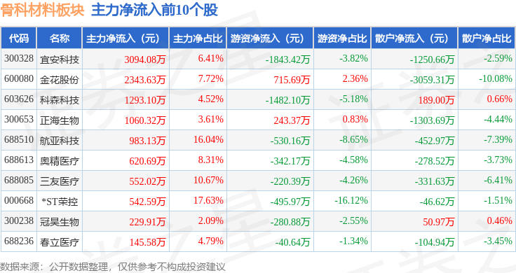 从资金流向上来看,当日骨科材料板块主力资金净流入9408.81万元,游资资金净流出5372.03万元,散户资金净流出4036.77万元。骨科材料板块个股资金流向见下表: