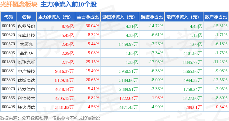 从资金流向上来看,当日光纤概念板块主力资金净流入24.22亿元,游资资金净流出14.66亿元,散户资金净流出9.55亿元。光纤概念板块个股资金流向见下表: