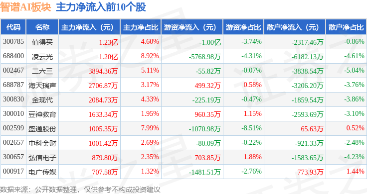 从资金流向上来看,当日智谱AI板块主力资金净流出26.69亿元,游资资金净流入9.08亿元,散户资金净流入17.61亿元。智谱AI板块个股资金流向见下表: