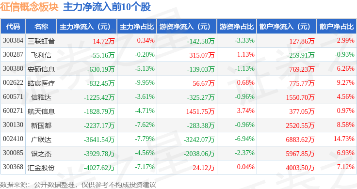 从资金流向上来看,当日征信概念板块主力资金净流出3.62亿元,游资资金净流出7470.96万元,散户资金净流入4.37亿元。征信概念板块个股资金流向见下表: