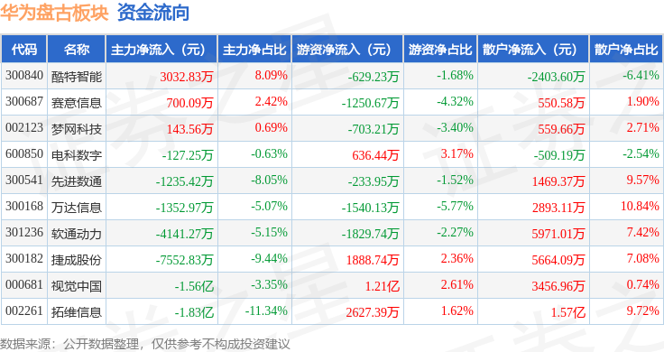 从资金流向上来看,当日华为盘古板块主力资金净流出4.44亿元,游资资金净流入1.11亿元,散户资金净流入3.34亿元。华为盘古板块个股资金流向见下表: