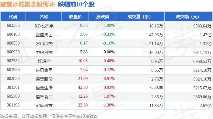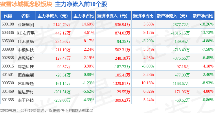 从资金流向上来看,当日蜜雪冰城概念股板块主力资金净流出2769.06万元,游资资金净流入7426.82万元,散户资金净流出4657.76万元。蜜雪冰城概念股板块个股资金流向见下表:
