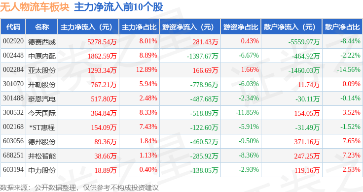从资金流向上来看,当日无人物流车板块主力资金净流出1.4亿元,游资资金净流入7739.78万元,散户资金净流入6289.11万元。无人物流车板块个股资金流向见下表:
