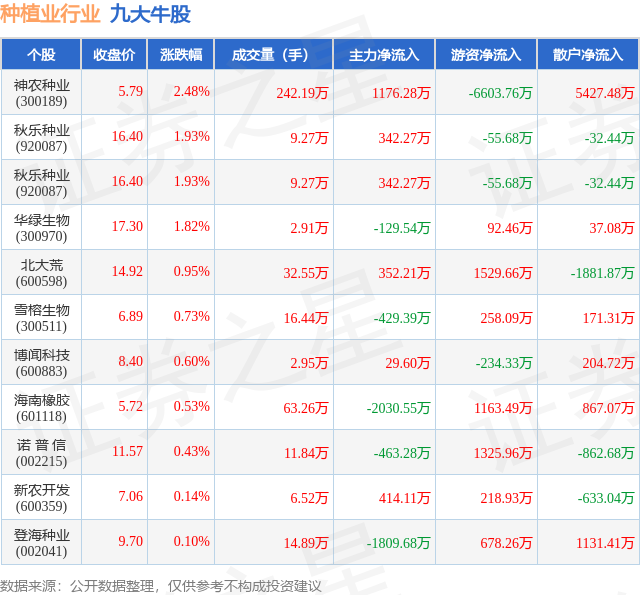 个股表现方面,种植业行业当日领涨股为神农种业(300189),该股当日报收5.79,上涨2.48%,成交量242.19万,主力资金净流入1176.28万元。秋乐种业(920087)以上涨1.93%紧随其后,该股当日成交量9.27万,主力资金净流入342.27万元。除此之外,秋乐种业(920087)、华绿生物(300970)、北大荒(600598)均进入当日牛股之列。具体个股列表见下表: