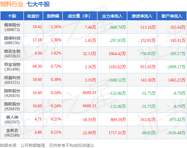 个股表现方面,饲料行业当日领涨股为佩蒂股份(300673),该股当日报收18.42,上涨2.56%,成交量7.46万,主力资金净流出868.79万元。路德科技(688156)以上涨1.36%紧随其后,该股当日成交量1.65万,主力资金净流出297.83万元。除此之外,傲农生物(603363)、乖宝宠物(301498)、邦基科技(603151)均进入当日牛股之列。具体个股列表见下表:
