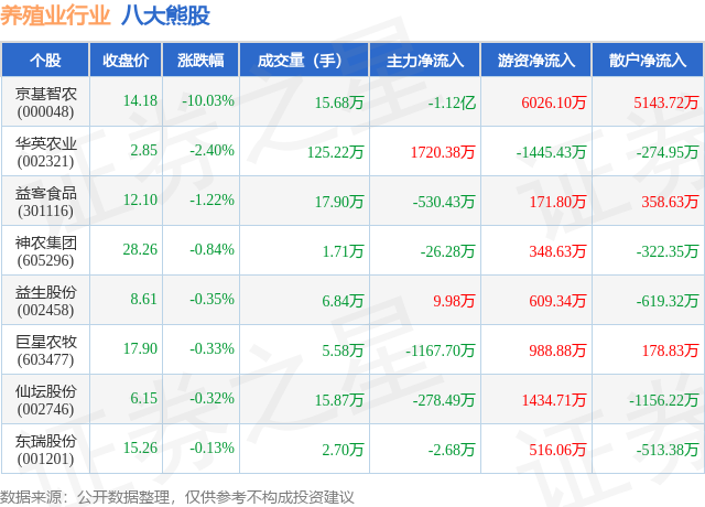 个股表现方面,养殖业行业当日领跌股为京基智农(000048),该股当日报收14.18,下跌10.03%,成交量15.68万,主力资金净流出1.12亿元。华英农业(002321)以下跌2.4%紧随其后,该股当日成交量125.22万,主力资金净流入1720.38万元。除此之外,益客食品(301116)、神农集团(605296)、益生股份(002458)均进入当日熊股之列。具体个股列表见下表: