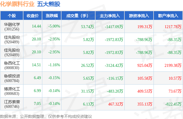个股表现方面,化学原料行业当日领跌股为华融化学(301256),该股当日报收14.44,下跌5.0%,成交量53.74万,主力资金净流出1417.09万元。佳先股份(920489)以下跌2.95%紧随其后,该股当日成交量5.82万,主力资金净流出1972.83万元。除此之外,佳先股份(920489)、鲁西化工(000830)、鲁银投资(600784)均进入当日熊股之列。具体个股列表见下表: