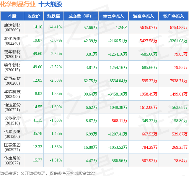 个股表现方面,化学制品行业当日领跌股为康达新材(002669),该股当日报收14.1,下跌4.41%,成交量57.66万,主力资金净流出1.24亿元。北化股份(002246)以下跌3.07%紧随其后,该股当日成交量42.39万,主力资金净流出2166.51万元。除此之外,锦华新材(920015)、锦华新材(920015)、高盟新材(300200)均进入当日熊股之列。具体个股列表见下表:
