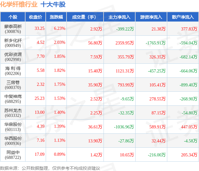 个股表现方面,化学纤维行业当日领涨股为蒙泰高新(300876),该股当日报收33.25,上涨6.23%,成交量2.92万,主力资金净流出399.22万元。新乡化纤(000949)以上涨2.03%紧随其后,该股当日成交量56.8万,主力资金净流入2359.95万元。除此之外,优彩资源(002998)、海 利 得(002206)、三房巷(600370)均进入当日牛股之列。具体个股列表见下表:
