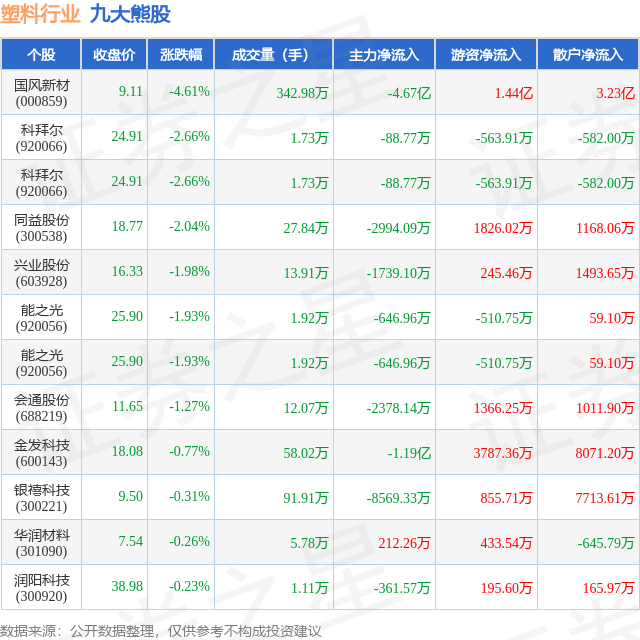 个股表现方面,塑料行业当日领跌股为国风新材(000859),该股当日报收9.11,下跌4.61%,成交量342.98万,主力资金净流出4.67亿元。科拜尔(920066)以下跌2.66%紧随其后,该股当日成交量1.73万,主力资金净流出88.77万元。除此之外,科拜尔(920066)、同益股份(300538)、兴业股份(603928)均进入当日熊股之列。具体个股列表见下表: