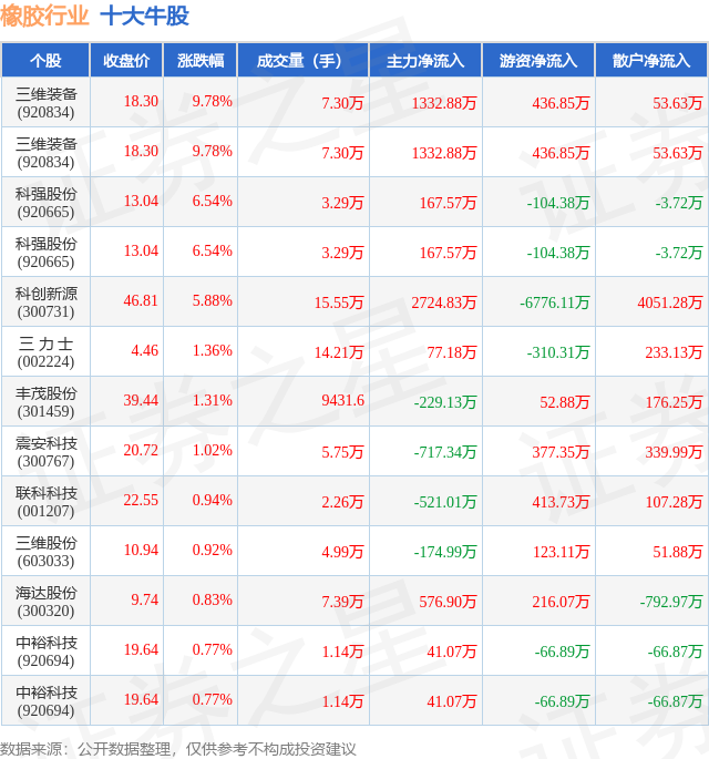 个股表现方面,橡胶行业当日领涨股为三维装备(920834),该股当日报收18.3,上涨9.78%,成交量7.3万,主力资金净流入1332.88万元。三维装备(920834)以上涨9.78%紧随其后,该股当日成交量7.3万,主力资金净流入1332.88万元。除此之外,科强股份(920665)、科强股份(920665)、科创新源(300731)均进入当日牛股之列。具体个股列表见下表:
