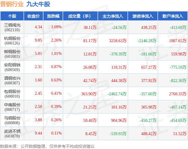 个股表现方面,普钢行业当日领涨股为三钢闽光(002110),该股当日报收4.34,上涨3.09%,成交量30.11万,主力资金净流出24.56万元。杭钢股份(600126)以上涨2.26%紧随其后,该股当日成交量81.17万,主力资金净流入3258.63万元。除此之外,柳钢股份(601003)、安阳钢铁(600569)、酒钢宏兴(600307)均进入当日牛股之列。具体个股列表见下表: