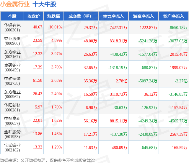 个股表现方面,小金属行业当日领涨股为华锡有色(600301),该股当日报收40.67,上涨10.01%,成交量29.37万,主力资金净流入7427.31万元。锡业股份(000960)以上涨4.89%紧随其后,该股当日成交量48.0万,主力资金净流入8318.31万元。除此之外,东方锆业(002167)、贵研铂业(600459)、中矿资源(002738)均进入当日牛股之列。具体个股列表见下表: