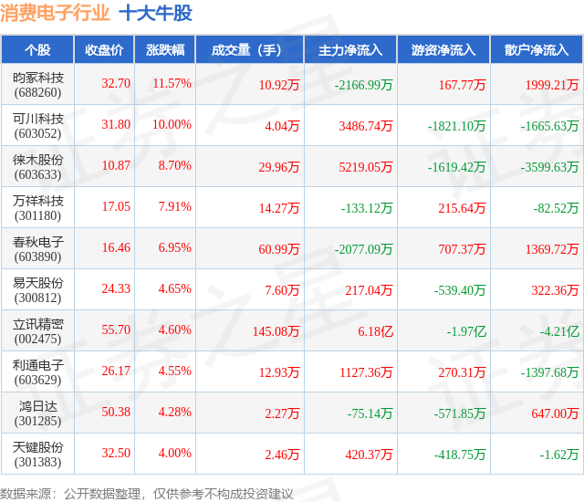 个股表现方面,消费电子行业当日领涨股为昀冢科技(688260),该股当日报收32.7,上涨11.57%,成交量10.92万,主力资金净流出2166.99万元。可川科技(603052)以上涨10.0%紧随其后,该股当日成交量4.04万,主力资金净流入3486.74万元。除此之外,徕木股份(603633)、万祥科技(301180)、春秋电子(603890)均进入当日牛股之列。具体个股列表见下表: