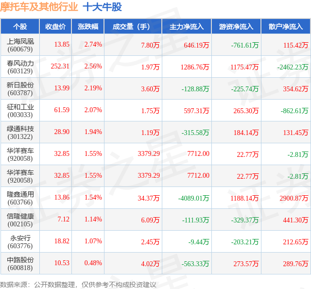 个股表现方面,摩托车及其他行业当日领涨股为上海凤凰(600679),该股当日报收13.85,上涨2.74%,成交量7.8万,主力资金净流入646.19万元。春风动力(603129)以上涨2.56%紧随其后,该股当日成交量1.97万,主力资金净流入1286.76万元。除此之外,新日股份(603787)、征和工业(003033)、绿通科技(301322)均进入当日牛股之列。具体个股列表见下表: