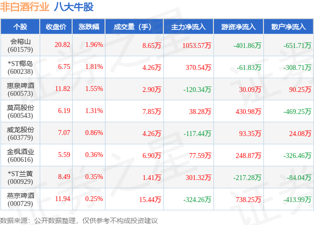 个股表现方面,非白酒行业当日领涨股为会稽山(601579),该股当日报收20.82,上涨1.96%,成交量8.65万,主力资金净流入1053.57万元。*ST椰岛(600238)以上涨1.81%紧随其后,该股当日成交量4.26万,主力资金净流入370.54万元。除此之外,惠泉啤酒(600573)、莫高股份(600543)、威龙股份(603779)均进入当日牛股之列。具体个股列表见下表: