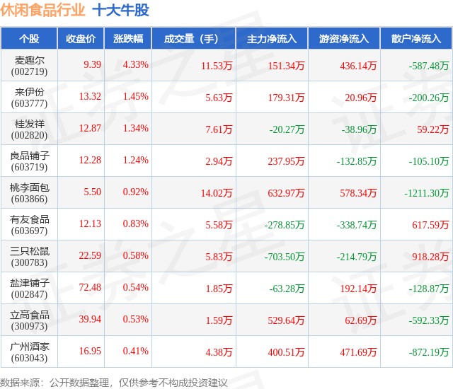 个股表现方面,休闲食品行业当日领涨股为麦趣尔(002719),该股当日报收9.39,上涨4.33%,成交量11.53万,主力资金净流入151.34万元。来伊份(603777)以上涨1.45%紧随其后,该股当日成交量5.63万,主力资金净流入179.31万元。除此之外,桂发祥(002820)、良品铺子(603719)、桃李面包(603866)均进入当日牛股之列。具体个股列表见下表: