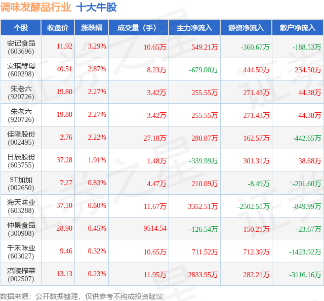 个股表现方面,调味发酵品行业当日领涨股为安记食品(603696),该股当日报收11.92,上涨3.29%,成交量10.65万,主力资金净流入549.21万元。安琪酵母(600298)以上涨2.87%紧随其后,该股当日成交量8.23万,主力资金净流出679.0万元。除此之外,朱老六(920726)、朱老六(920726)、佳隆股份(002495)均进入当日牛股之列。具体个股列表见下表: