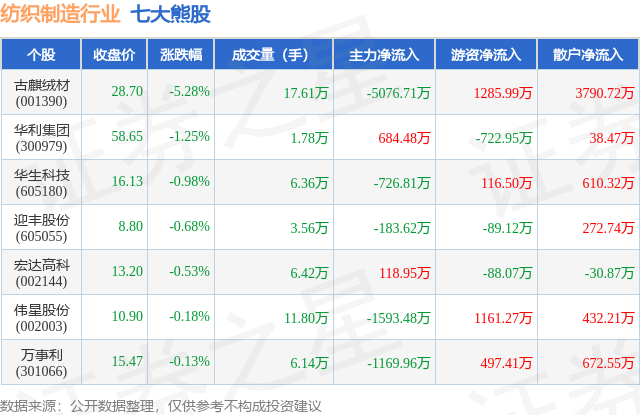 个股表现方面,纺织制造行业当日领跌股为古麒绒材(001390),该股当日报收28.7,下跌5.28%,成交量17.61万,主力资金净流出5076.71万元。华利集团(300979)以下跌1.25%紧随其后,该股当日成交量1.78万,主力资金净流入684.48万元。除此之外,华生科技(605180)、迎丰股份(605055)、宏达高科(002144)均进入当日熊股之列。具体个股列表见下表: