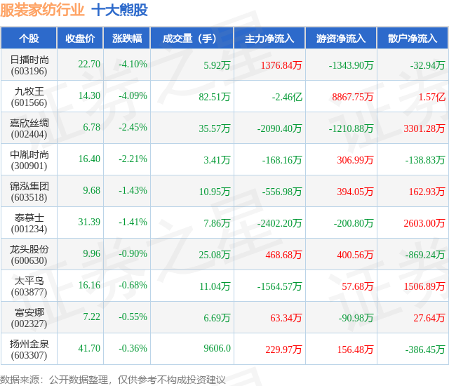 个股表现方面,服装家纺行业当日领跌股为日播时尚(603196),该股当日报收22.7,下跌4.1%,成交量5.92万,主力资金净流入1376.84万元。九牧王(601566)以下跌4.09%紧随其后,该股当日成交量82.51万,主力资金净流出2.46亿元。除此之外,嘉欣丝绸(002404)、中胤时尚(300901)、锦泓集团(603518)均进入当日熊股之列。具体个股列表见下表: