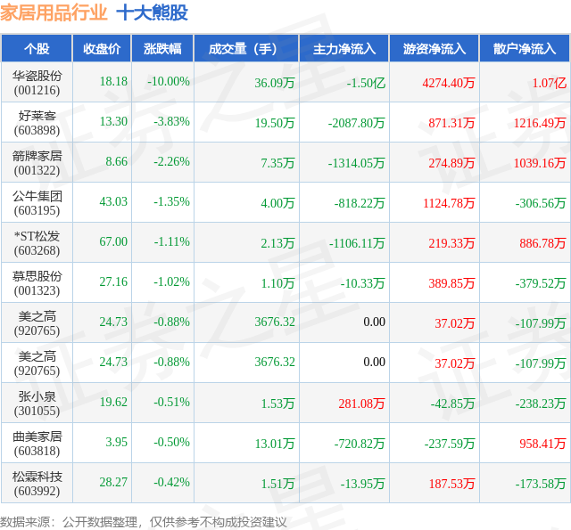 个股表现方面,家居用品行业当日领跌股为华瓷股份(001216),该股当日报收18.18,下跌10.0%,成交量36.09万,主力资金净流出1.5亿元。好莱客(603898)以下跌3.83%紧随其后,该股当日成交量19.5万,主力资金净流出2087.8万元。除此之外,箭牌家居(001322)、公牛集团(603195)、*ST松发(603268)均进入当日熊股之列。具体个股列表见下表: