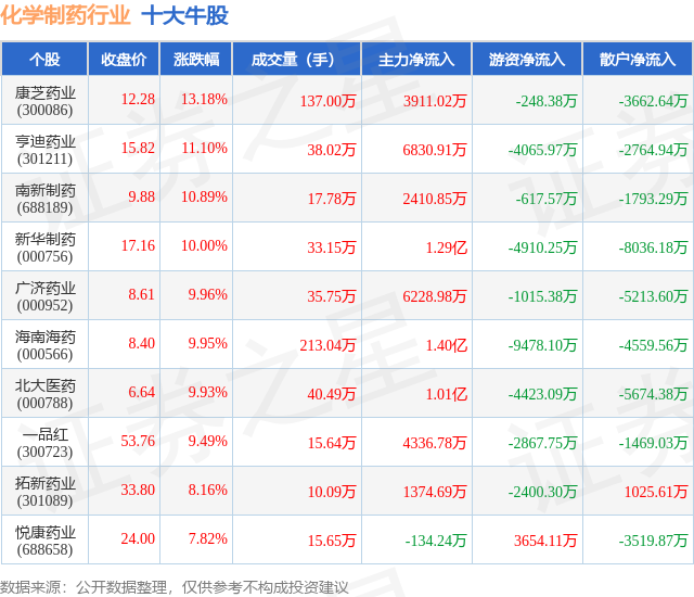个股表现方面,化学制药行业当日领涨股为康芝药业(300086),该股当日报收12.28,上涨13.18%,成交量137.0万,主力资金净流入3911.02万元。亨迪药业(301211)以上涨11.1%紧随其后,该股当日成交量38.02万,主力资金净流入6830.91万元。除此之外,南新制药(688189)、新华制药(000756)、广济药业(000952)均进入当日牛股之列。具体个股列表见下表: